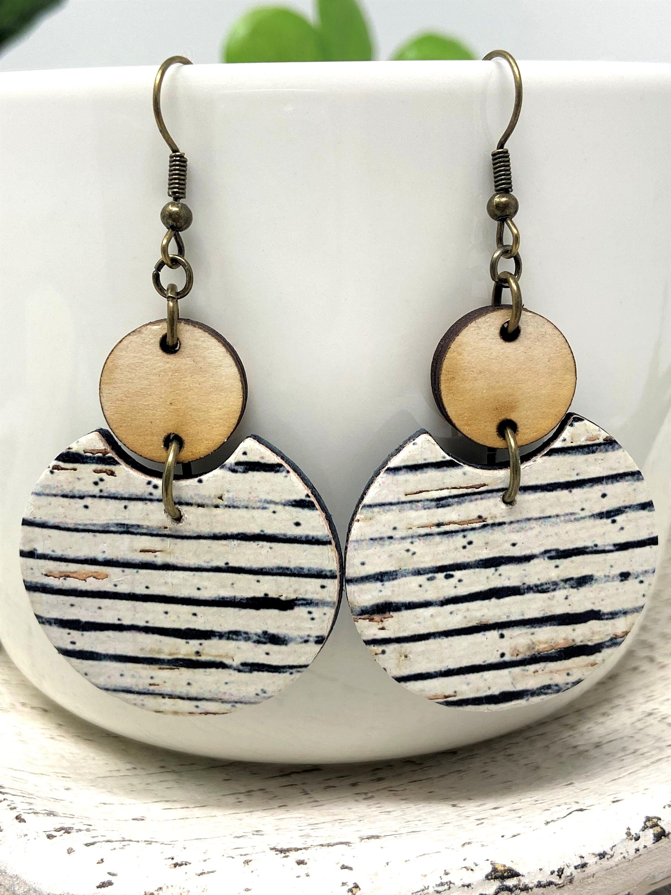 The earrings are made with round distressed stained wood and round black & white vintage striped cork backed with soft black genuine leather.