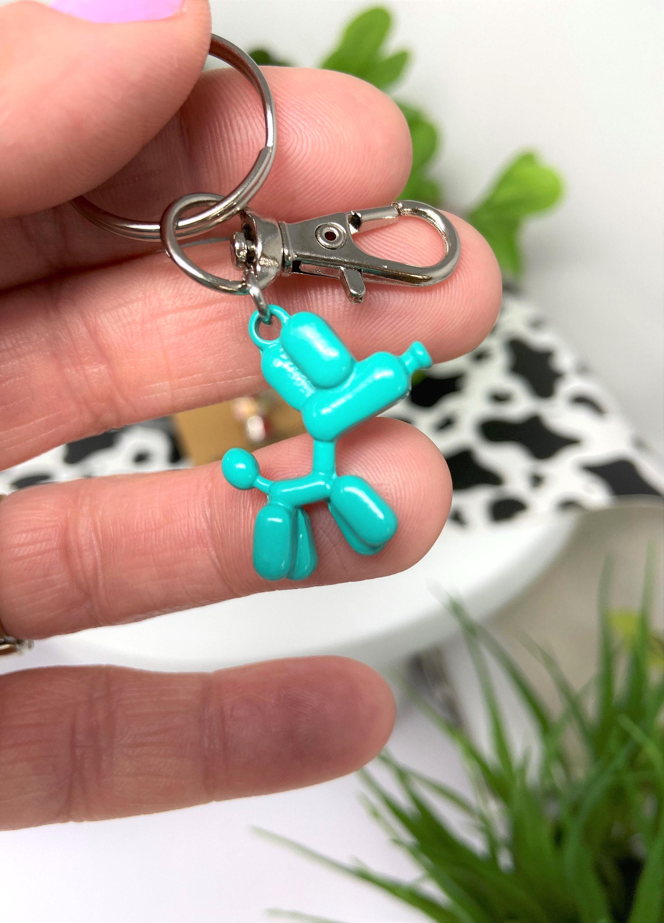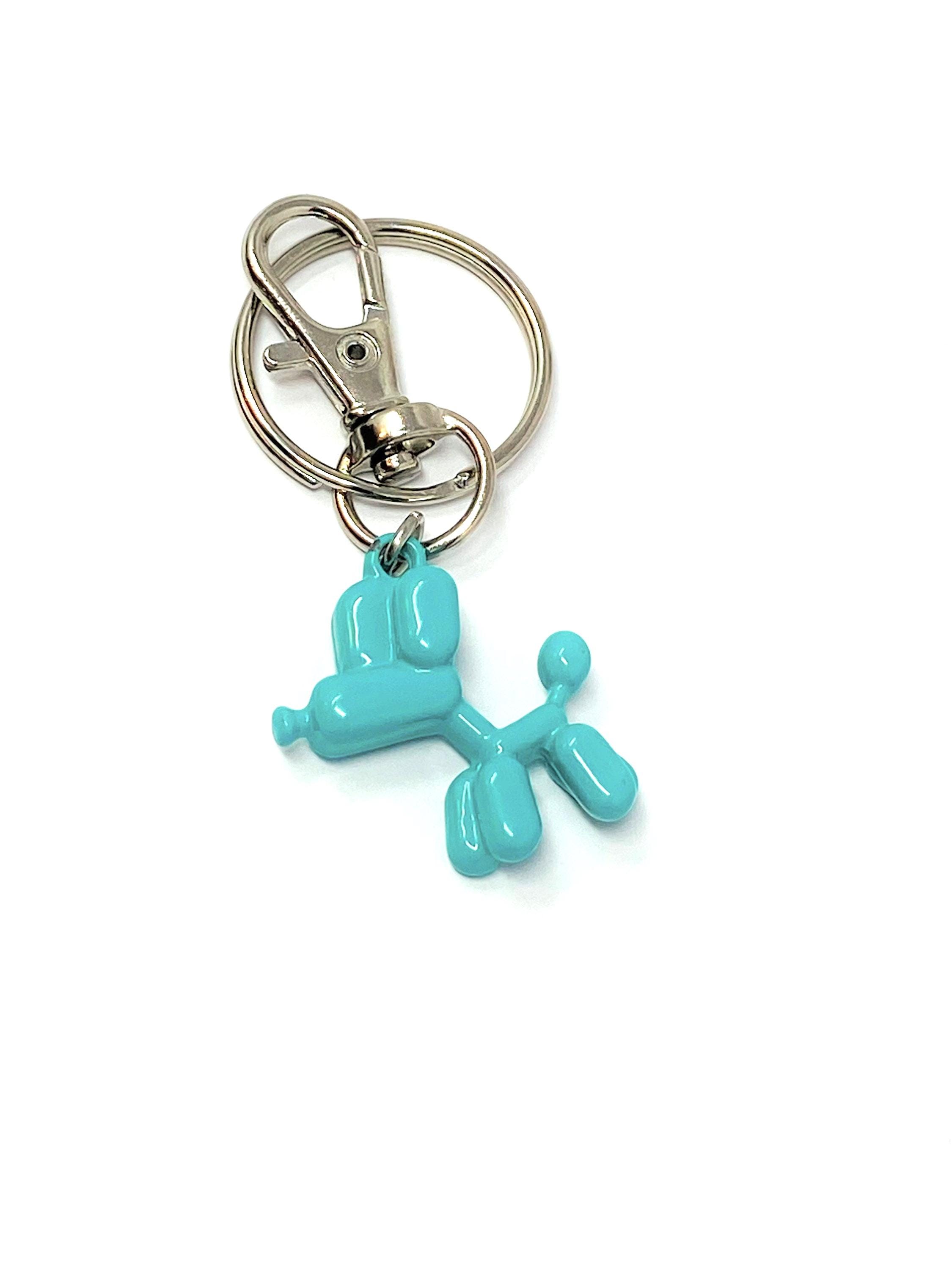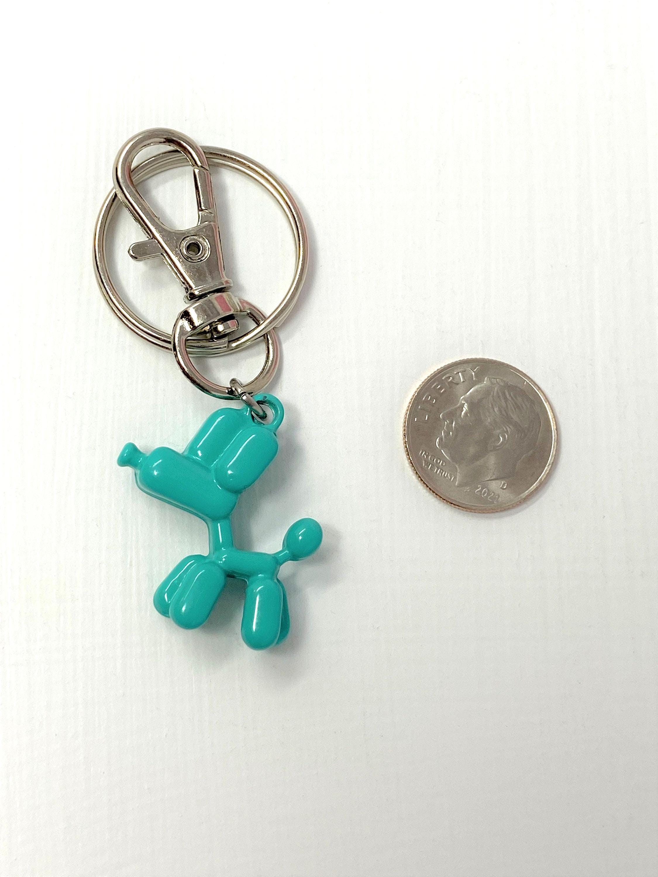Key chain includes balloon dog charm, swivel clip hook and key ring hook.