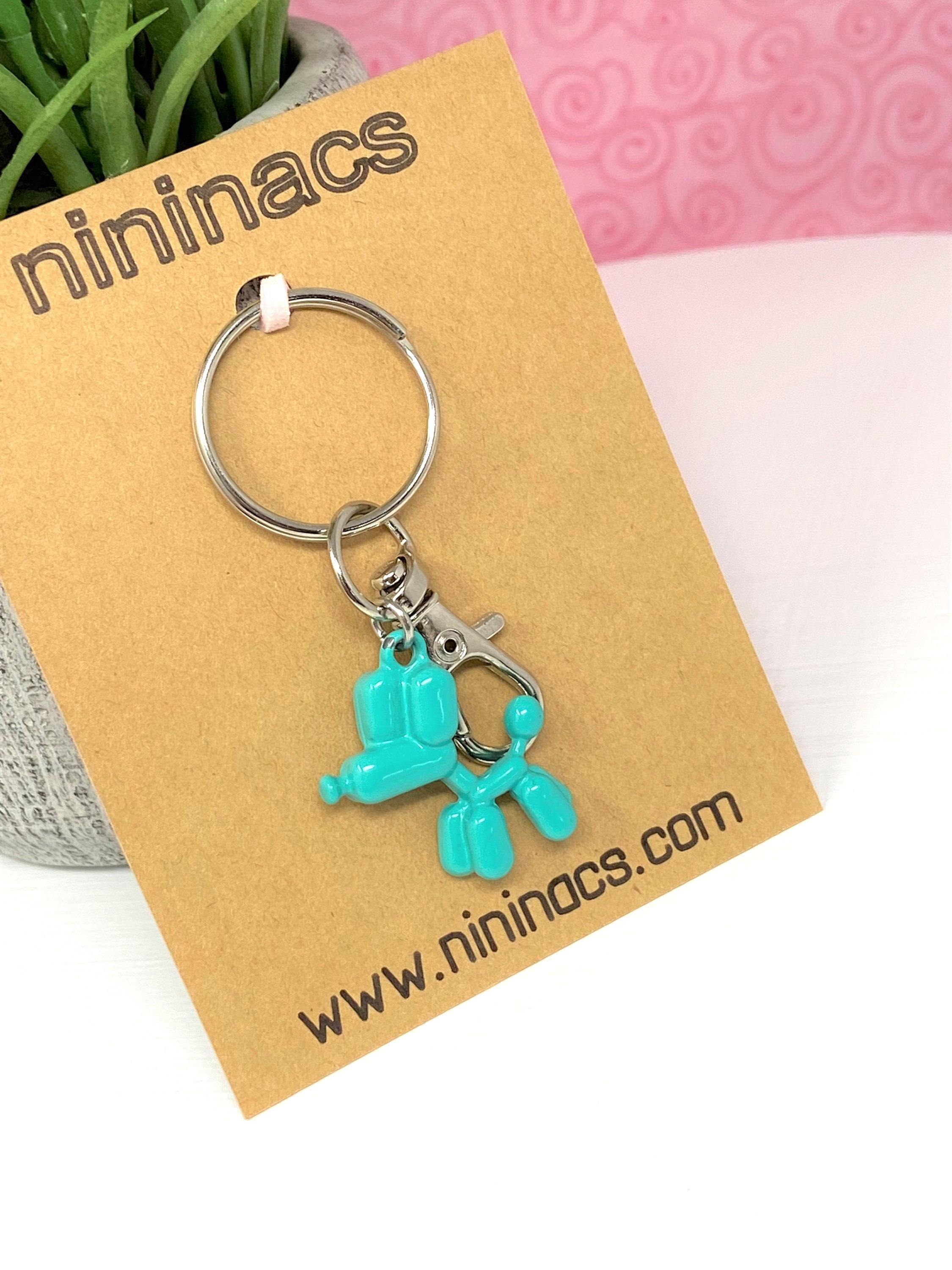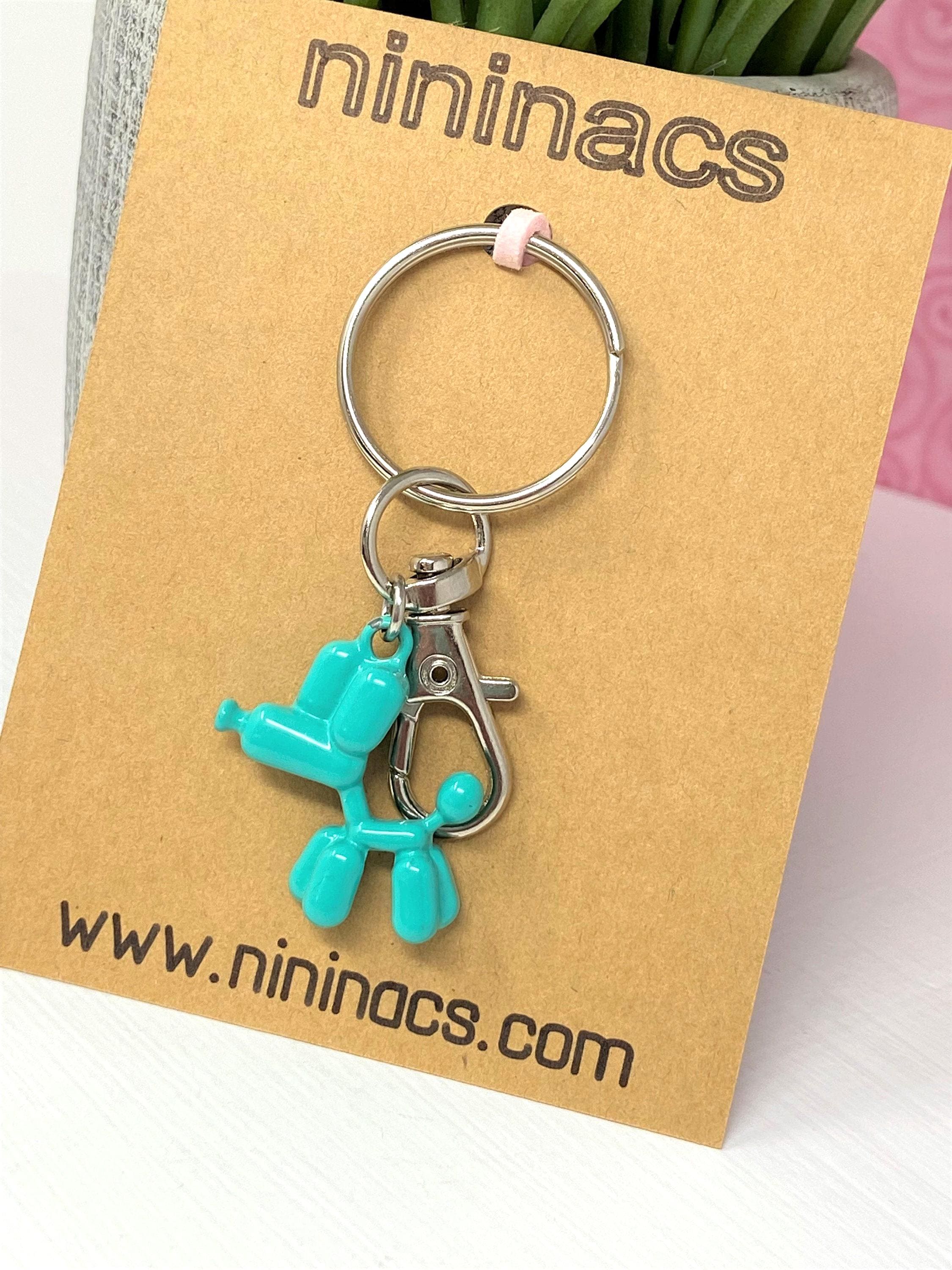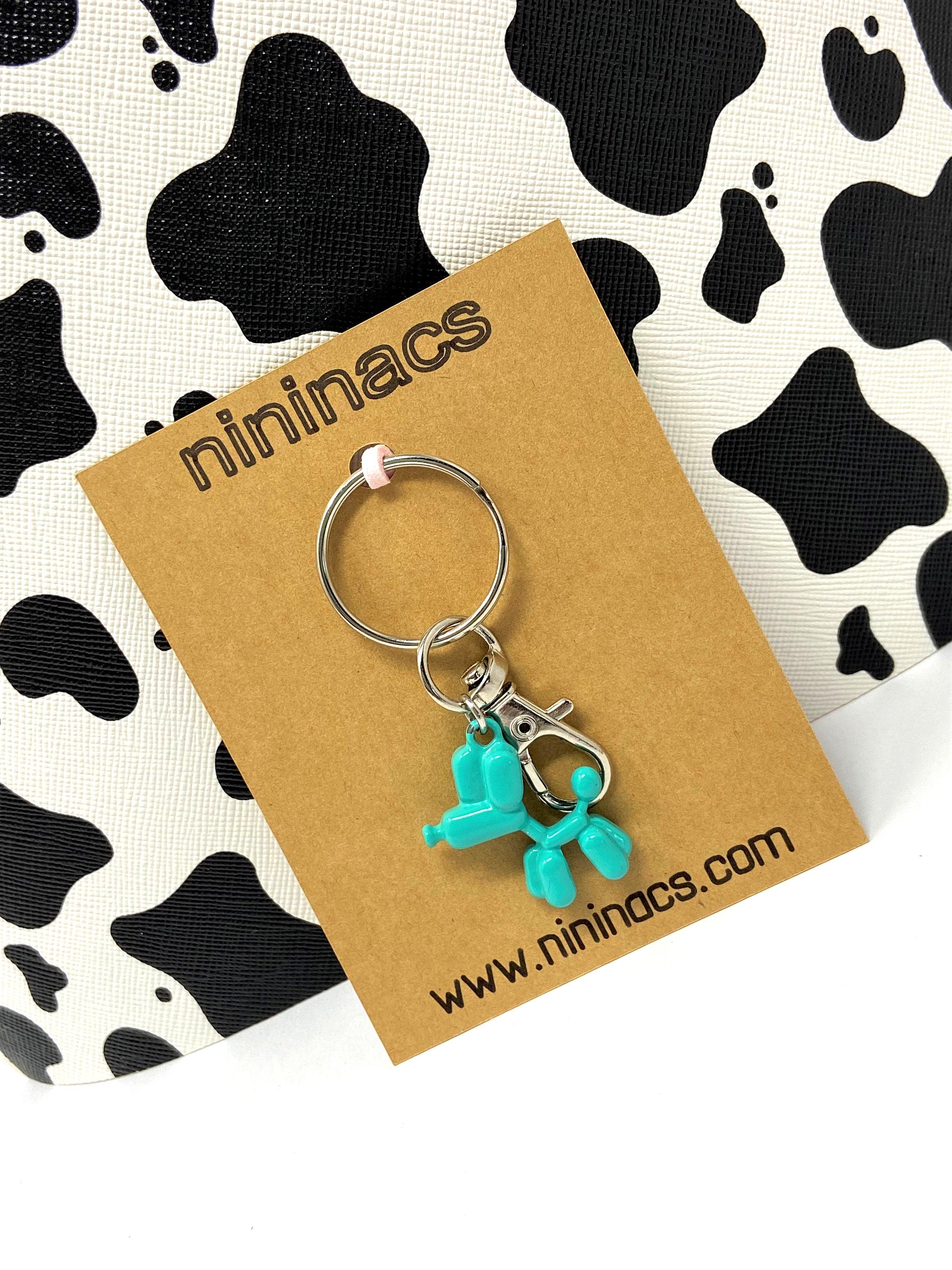 Key chain includes balloon dog charm, swivel clip hook and key ring hook.