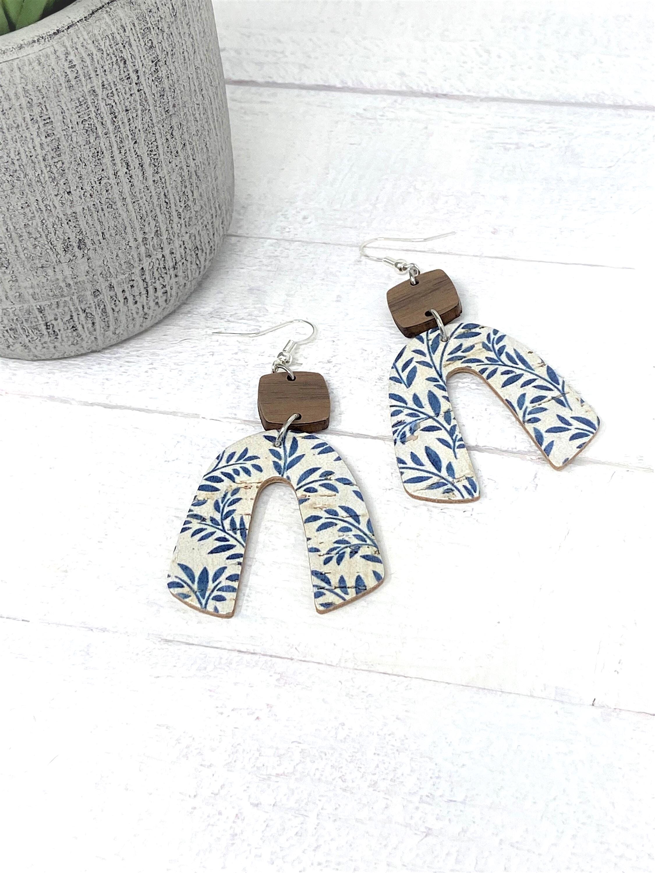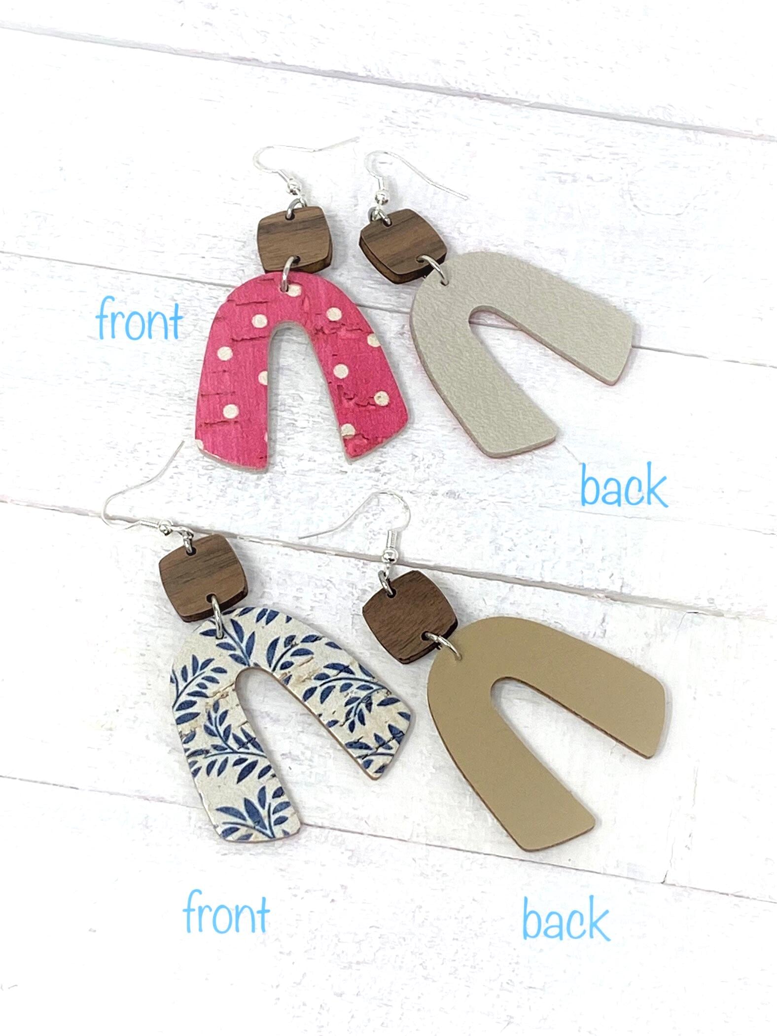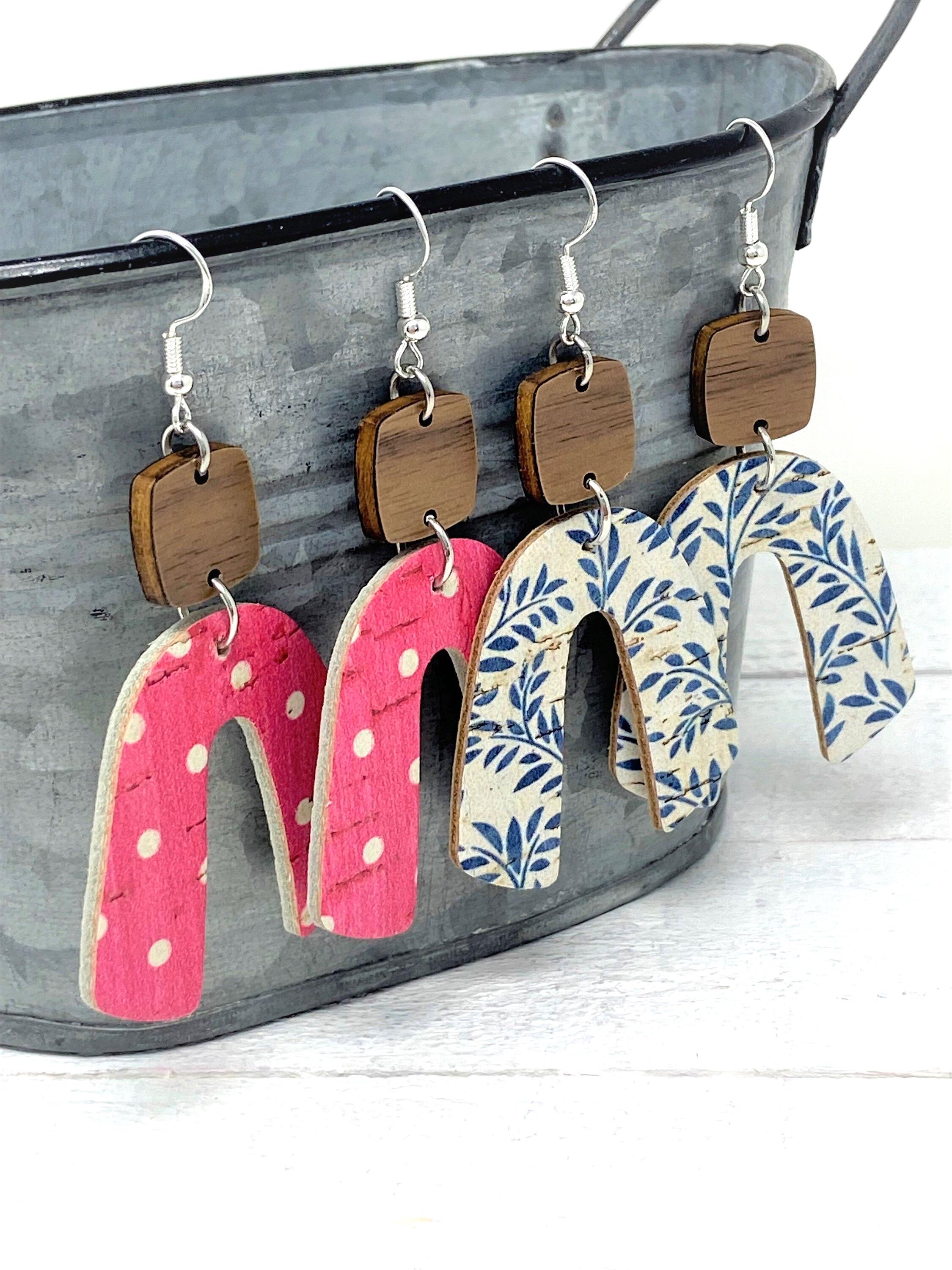These arched cuties are large sized cork earrings with a leather back hanging from a small wooden square.