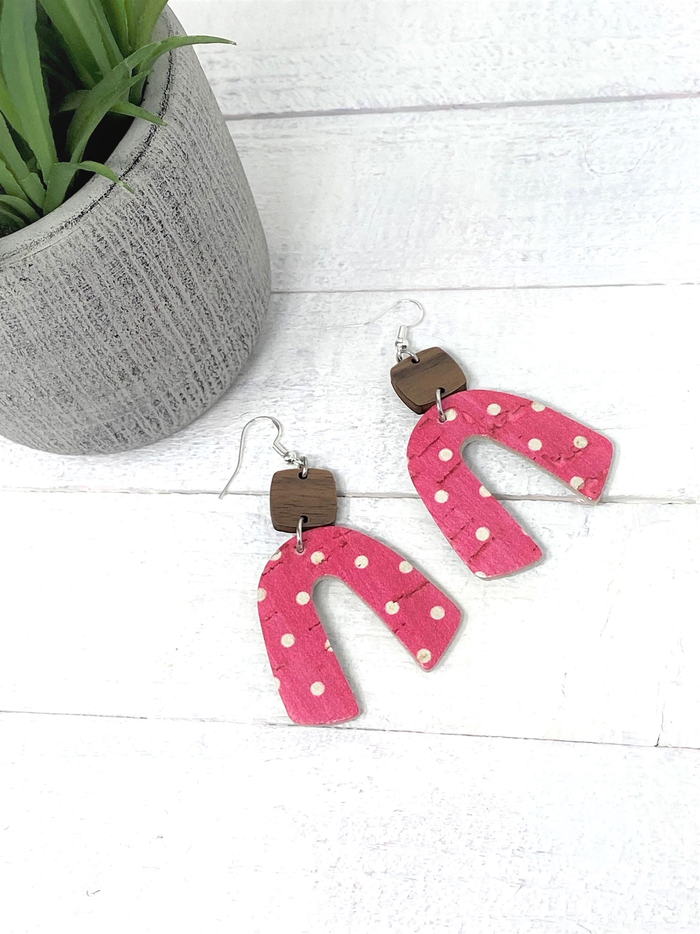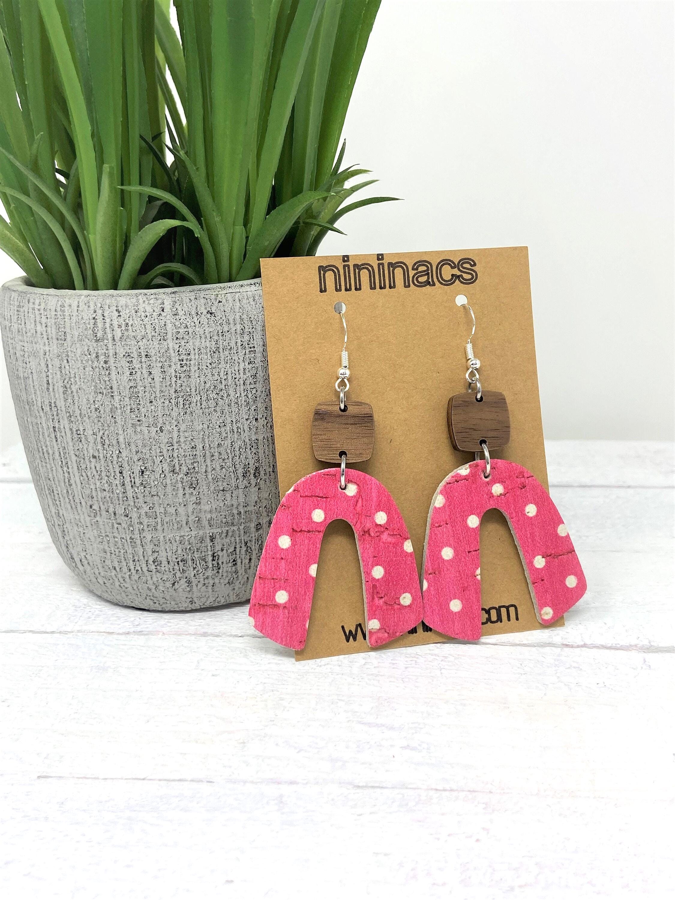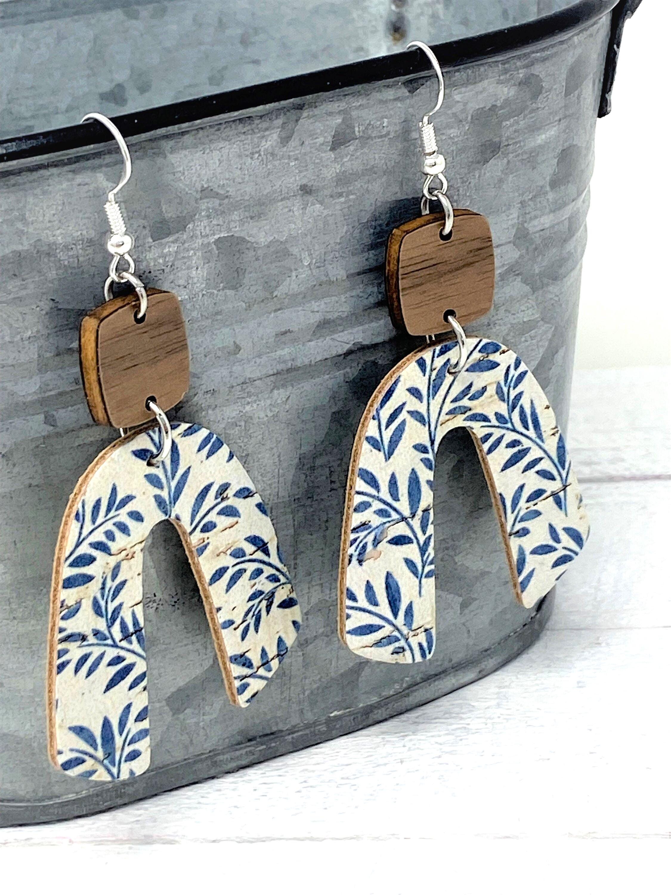 These arched cuties are large sized cork earrings with a leather back hanging from a small wooden square.